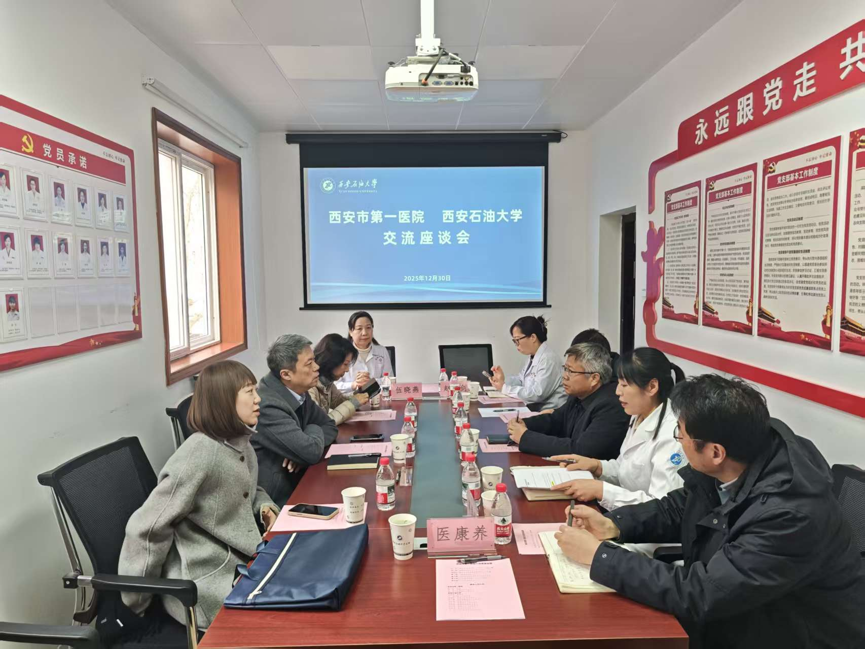 張驍勇對(duì)專家團(tuán)隊(duì)的到訪表示熱烈歡迎,感謝西安市第一醫(yī)院長(zhǎng)期以來對(duì)我校醫(yī)療保障工作的大力支持與無私幫扶,隨后陪同薛剛一行實(shí)地察看校醫(yī)院診療環(huán)境、設(shè)備配置及服務(wù)流程,全面精準(zhǔn)掌握校醫(yī)院運(yùn)營(yíng)現(xiàn)狀與發(fā)展需求。張驍勇詳細(xì)介紹學(xué)校辦學(xué)沿革、發(fā)展規(guī)劃及學(xué)科特色,強(qiáng)調(diào)我校始終堅(jiān)守“建設(shè)幸福西石大、培養(yǎng)行業(yè)專業(yè)人才”核心使命,在基層醫(yī)療服務(wù)提質(zhì)增效、教職工及離退休人員健康精準(zhǔn)管理等工作中,亟需優(yōu)質(zhì)MDT診療資源提供專業(yè)化指導(dǎo)與全方位支撐。薛剛對(duì)我校的熱情接待表示感謝,并介紹了西安市第一醫(yī)院歷史沿革、優(yōu)勢(shì)專科建設(shè)成效及MDT協(xié)作診療實(shí)踐成效,明確醫(yī)院正全面貫徹落實(shí)國(guó)家醫(yī)療健康戰(zhàn)略部署,依托“特色健康管理與醫(yī)康養(yǎng)深度融合”創(chuàng)新體系形成顯著優(yōu)勢(shì),希望與學(xué)校醫(yī)院聚焦健康管理優(yōu)化、養(yǎng)老服務(wù)精準(zhǔn)對(duì)接、康復(fù)診療能力提升三大方向,深化務(wù)實(shí)合作、實(shí)現(xiàn)互利共贏。雙方圍繞優(yōu)質(zhì)醫(yī)療資源下沉落地、急診急救綠色通道搭建、疑難病例雙向轉(zhuǎn)診、醫(yī)療服務(wù)能力提升及MDT協(xié)作流程優(yōu)化等醫(yī)聯(lián)體建設(shè)關(guān)鍵議題深入研討,為后續(xù)深化醫(yī)校聯(lián)動(dòng)、構(gòu)建優(yōu)質(zhì)高效的健康服務(wù)體系筑牢堅(jiān)實(shí)基礎(chǔ)。