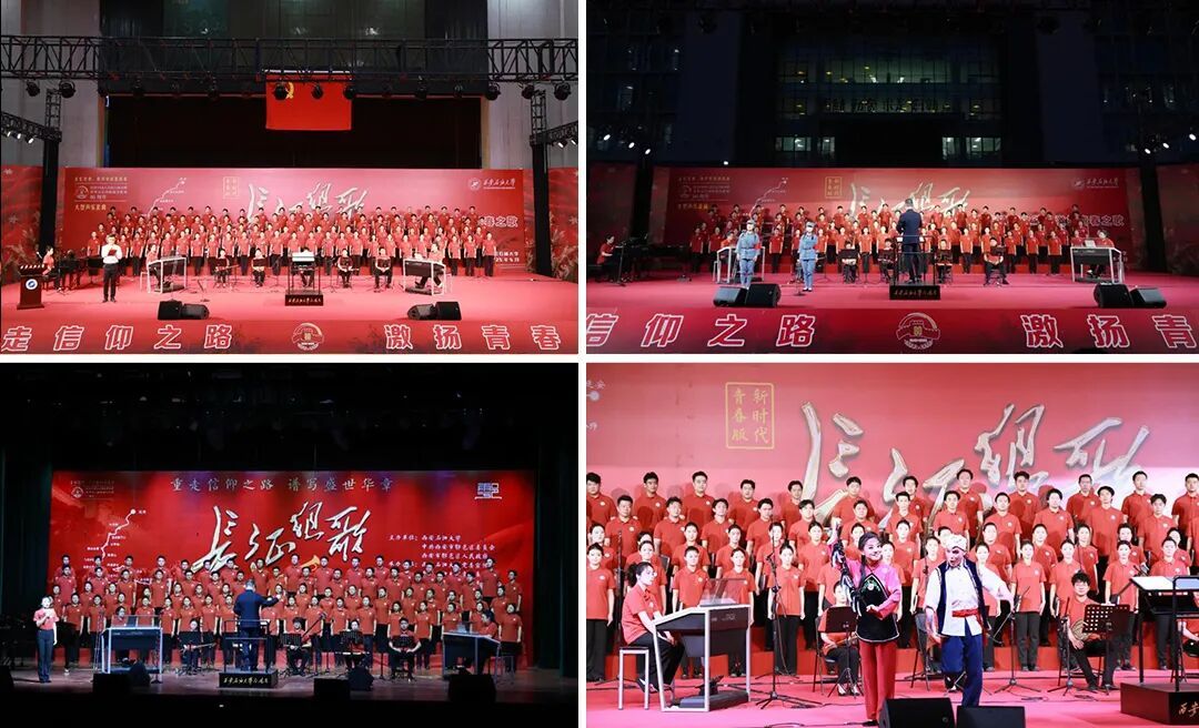 《長征組歌》音樂黨課鑄魂,黨建育人融入藝術實踐?!?/strong>長征組歌》音樂黨課作為黨建與藝術美育深度融合的創(chuàng)新實踐,以藝術化表達與沉浸式體驗的表達方式激活紅色記憶,將波瀾壯闊的長征史詩轉(zhuǎn)化為可聽、可感、可悟的沉浸式藝術思政課。宣講人化身“精神火炬手”,在雄渾旋律中串聯(lián)歷史節(jié)點、講述英雄故事,讓師生在音符與敘事的共鳴中深刻體悟理想信念的力量。該黨課不僅在校園內(nèi)常態(tài)化展演,更走出校門、走進政府機關、醫(yī)療機構,奔赴革命圣地延安等地開展公益演出,將紅色基因傳遞到更廣闊的空間。這種黨建與美育的雙向賦能模式,使黨建育人從理論灌輸升華為情感認同,讓紅色精神在藝術熏陶中落地生根,成為學校黨建育人的特色品牌。