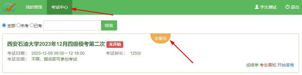 2、登錄成功后點(diǎn)擊“考試中心”,點(diǎn)擊對(duì)應(yīng)的場(chǎng)次“去報(bào)名”,填寫好自己的個(gè)人信息,點(diǎn)擊確定后即可報(bào)名成功,要保證個(gè)人信息無(wú)誤,避免影響成績(jī)。(班級(jí)填寫教學(xué)班,如B213)