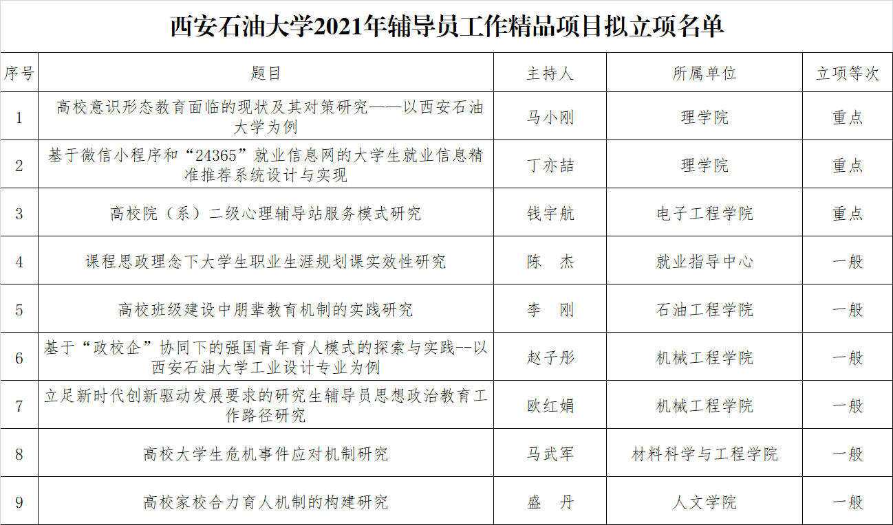根據(jù)《關(guān)于開展2021年輔導(dǎo)員工作精品項目和研究課題申報的通知》(學(xué)工函〔202152號)的工作安排,經(jīng)個人申報、所在單位推薦和專家評審,擬對2021年輔導(dǎo)員工作精品項目9項、輔導(dǎo)員工作研究課題15項立項建設(shè)?,F(xiàn)將擬立項名單予以公示。