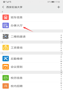 已關(guān)注“西安石油大學(xué)”微信企業(yè)號的師生通過點擊微信“通訊錄”->我的企業(yè)中的“西安石油大學(xué)”->“辦事大廳”進入并選擇業(yè)務(wù)進行辦理。