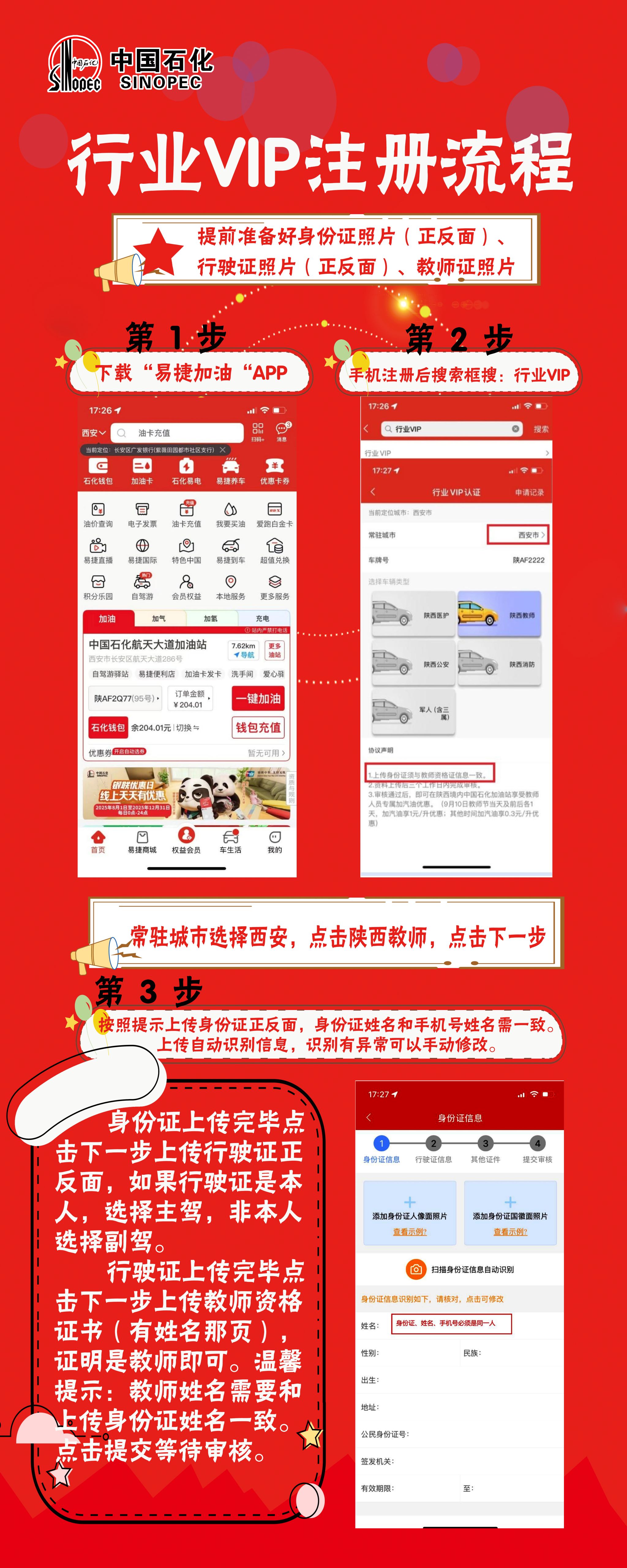 下載“易捷加油“APP→手機(jī)完成注冊(cè)后搜索框搜:行業(yè)VIP→上傳身份證(正反面)、行駛證(正反面)、教師證或工作證(帶名字及單位章頁),進(jìn)行專項(xiàng)認(rèn)證→提交審核→通過后自動(dòng)加入對(duì)應(yīng)標(biāo)簽并享受優(yōu)惠政策。具體操作詳見下圖: