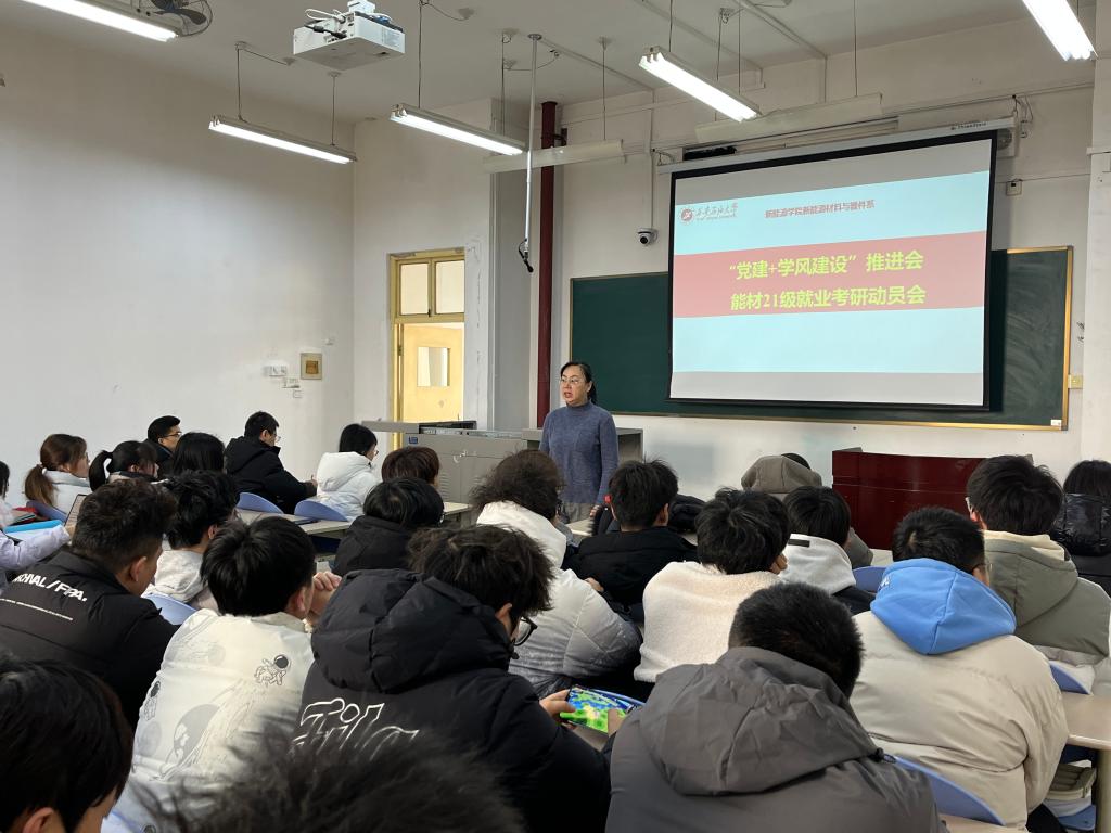 為進一步加強學院學風建設,構建“黨建+學風”協(xié)同育人模式,助推學院考研就業(yè)工作,12月19日上午,新能源學院“黨建+學風建設”推進會暨2021級考研就業(yè)動員大會在鄠邑校區(qū)博覽樓427室舉行。新能源材料與器件系主任肖美霞、副主任王磊,新能源材料與器件系教工黨支部書記安敏榮,青年教師何萌,能材2101-2102班班主任王黨會、李釗,輔導員馬武軍及能材專業(yè)2021級全體學生參會,會議由肖美霞主持。