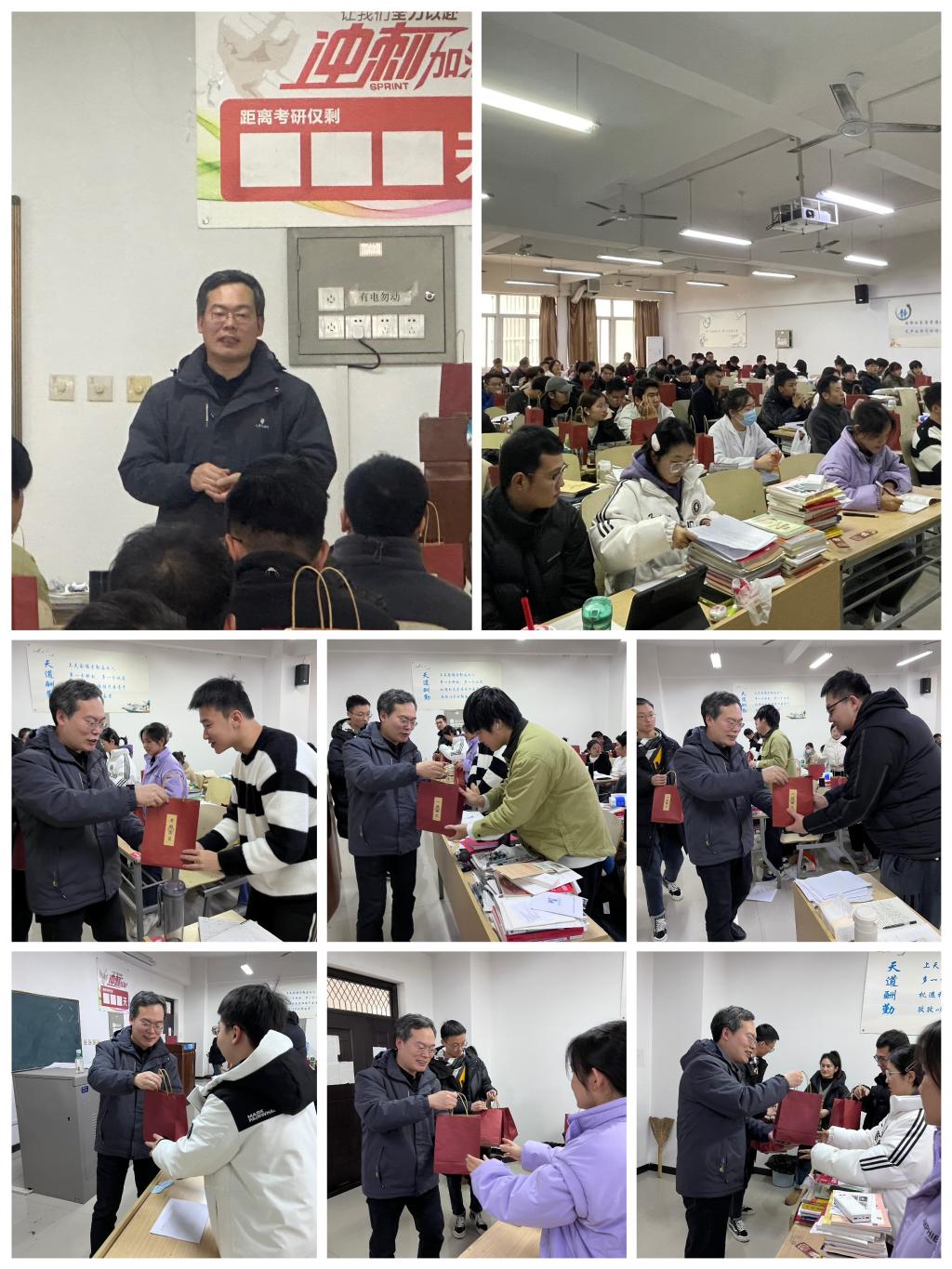 張建高充分肯定了同學們堅持不懈、勇于追夢的精神,并結(jié)合往年考研情況全面分析了當前的考研形勢。他親切詢問了考研學子的備考狀態(tài)并叮囑同學們:一是做好考前身心健康管理,規(guī)律作息,保證考試前身心健康,心無旁騖,繼續(xù)維持良好的學習狀態(tài);二是做好考前復習規(guī)劃,要總結(jié)要點,查漏補缺,確保每一個知識點都能夠熟練掌握;三是提醒同學們要注意考場秩序,嚴格遵守考試紀律,避免因為一些不必要的失誤而影響考試成績。同時鼓勵同學們在最后沖刺階段要調(diào)整好心態(tài),以必勝的信念迎接挑戰(zhàn)。他還表示學院將持續(xù)做好考研學子后勤保障服務工作,會竭盡全力幫助學生解決實際困難。