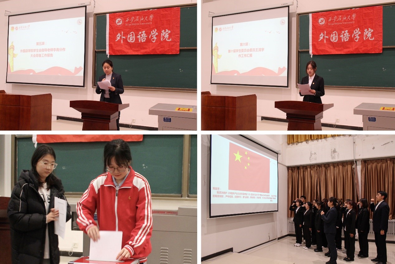 周宇宣讀了校團委、校學生會《關于同意召開西安石油大學外國語學院第十一次團委屆內調整大會暨學生代表大會的批復》。聽取和審議了李青分作的《外國語學院第十一次團委屆內調整大會暨學生代表大會籌備工作報告》和第十屆學生委員會代表王清宇作的《忠誠擔當守初心,履職盡責作表率,建設聽黨話、肯奮斗、強引領的學生會組織》報告。選舉產生了新一屆學院團委委員和學生委員會委員,并進行宣誓。