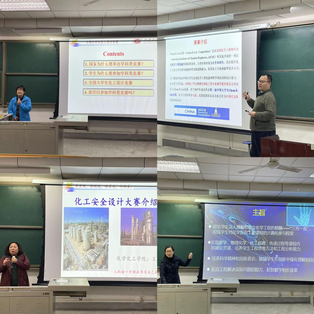 隨后,學(xué)科競賽指導(dǎo)老師劉菊榮、范崢、王進(jìn)、唐璇依次就“全國大學(xué)生化工設(shè)計競賽”“全國大學(xué)生化工實(shí)驗大賽”“中國大學(xué)生Chem-E-Car競賽”“全國大學(xué)生化工過程數(shù)字創(chuàng)新競賽”“全國大學(xué)生化工安全設(shè)計大賽”“全國“互聯(lián)網(wǎng)+化學(xué)反應(yīng)過程”大學(xué)生課模設(shè)計大賽”等化工學(xué)科競賽有針對性的介紹分析了競賽概況、賽程與賽制、競賽內(nèi)容、競賽特點(diǎn)和我校以往獲獎情況,鼓勵同學(xué)們積極參與,勇于嘗試,提升自己的專業(yè)和創(chuàng)新能力,努力在競賽中取得新的突破。