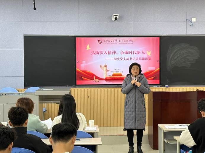 為深入開展學(xué)習(xí)貫徹習(xí)近平新時(shí)代中國(guó)特色社會(huì)主義思想主題教育,激發(fā)廣大黨員責(zé)任意識(shí),擔(dān)當(dāng)意識(shí),激勵(lì)全體黨員繼承和弘揚(yáng)鐵人精神,進(jìn)一步發(fā)揚(yáng)紅色傳統(tǒng),賡續(xù)紅色血脈。電子工程學(xué)院于2023年11月13日在博覽樓209舉辦“弘揚(yáng)鐵人精神,爭(zhēng)做時(shí)代新人”學(xué)生黨支部書記講黨課活動(dòng),院黨委副書記畢軼慧,學(xué)生工作辦公室主任錢宇航,院兼職組織員李君及各支部支委等四十余名師生參加,會(huì)議由2022級(jí)輔導(dǎo)員沈軒羽主持。