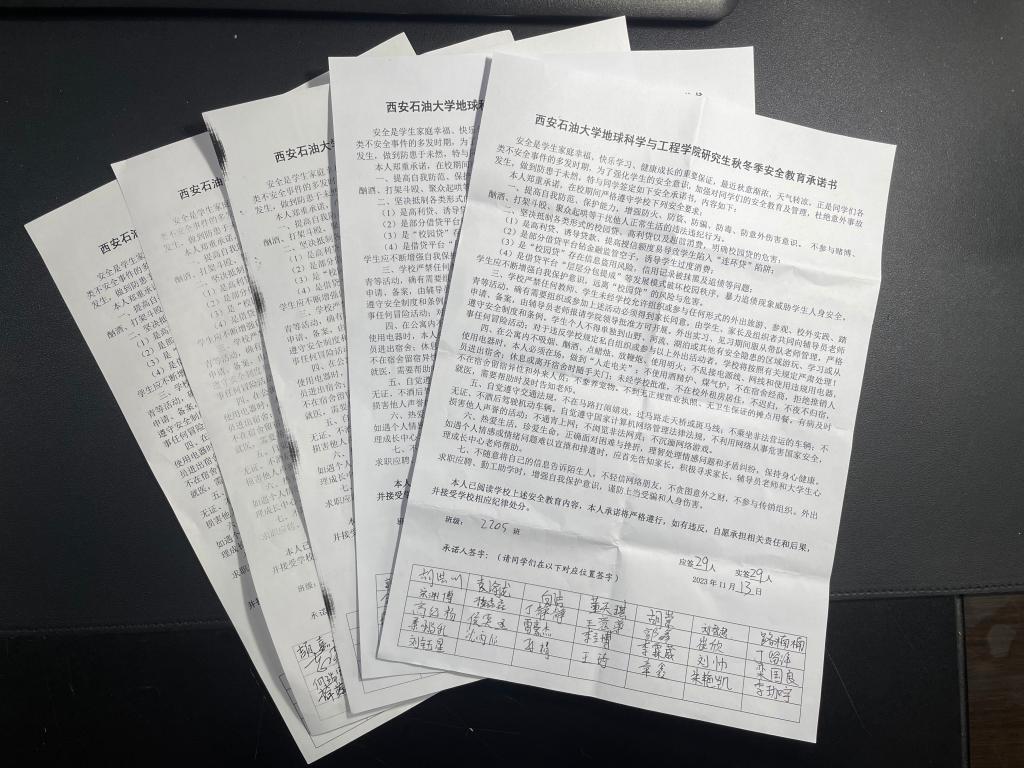 研究生輔導(dǎo)員姜英哲、陳斌圍繞消防安全教育、心理健康教育、交通安全教育、網(wǎng)絡(luò)安全教育、飲食衛(wèi)生安全等方面內(nèi)容,結(jié)合實(shí)際案例,針對(duì)秋冬季可能存在的各類安全問(wèn)題,分別召開(kāi)了研究生年級(jí)大會(huì)、學(xué)生干部會(huì)議和主題班會(huì),做到全院全覆蓋、無(wú)遺漏。組織全體研究生學(xué)習(xí)了《研究生手冊(cè)(2023年)》、《關(guān)于加強(qiáng)學(xué)生宿舍消防安全工作的通知》以及《西安石油大學(xué)校園文明騎行倡議書》相關(guān)內(nèi)容,在校研究生簽署了《西安石油大學(xué)地球科學(xué)與工程學(xué)院研究生秋冬季安全教育承諾書》。下一步,學(xué)院還將加強(qiáng)對(duì)辦公室、實(shí)驗(yàn)室、學(xué)生公寓等場(chǎng)所的日常管理和安全隱患排查,加強(qiáng)輔導(dǎo)員與研究生導(dǎo)師、學(xué)生干部之間的協(xié)同聯(lián)動(dòng),做到防患于未然、化解于萌芽。