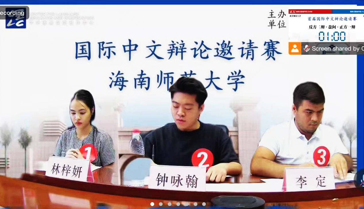 10月28日上午,由教育部中外語言交流合作中心主辦,海南師范大學(xué)承辦的首屆國際中文辯論邀請賽預(yù)賽在線上舉行,包括北京師范大學(xué)、暨南大學(xué)、西南大學(xué)和我校在內(nèi)的全國二十所高校的國際學(xué)生代表隊(duì)受邀參賽。我校代表隊(duì)由2020級電子商務(wù)專業(yè)本科生鐘詠翰同學(xué)(馬來西亞)、2022級材料科學(xué)與工程專業(yè)碩士研究生李定同學(xué)(塔吉克斯坦)、2023級漢語國際教育碩士研究生林梓妍同學(xué)(泰國)組成。