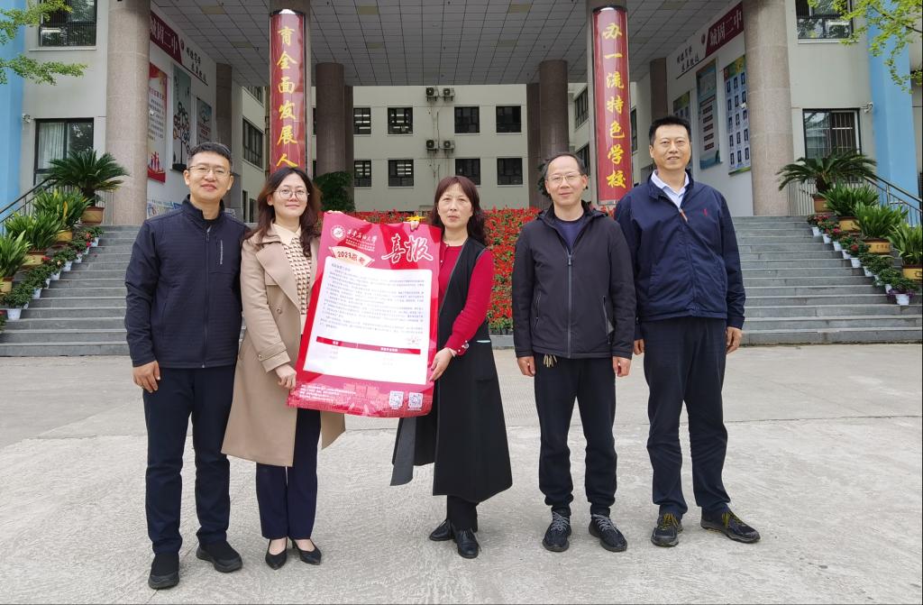 為了進一步推進我院“優(yōu)秀生源基地”建設,加強學校和生源地中學的交流與合作,10月10日上午,外國語學院黨委書記田虹霞、教務處副處長陳熙、外國語學院副院長陳武、教學辦主任尹曉嬌一行四人前往城固縣第二中學,為中學送去2023年招生喜報。城固縣第二中學副校長李小蘭、校長辦公室主任李紅軍代表中學接收喜報。
