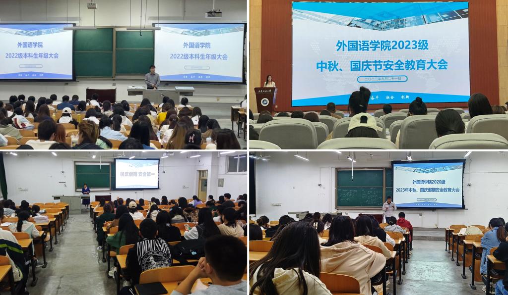 為切實做好學(xué)生教育管理服務(wù)工作,提高學(xué)生安全意識,筑牢安全防線,按照學(xué)校安排,外國語學(xué)院各年級輔導(dǎo)員分別在鄠邑校區(qū)弘石報告廳、B114、A234、B214召開2023年中秋國慶假期安全教育大會。