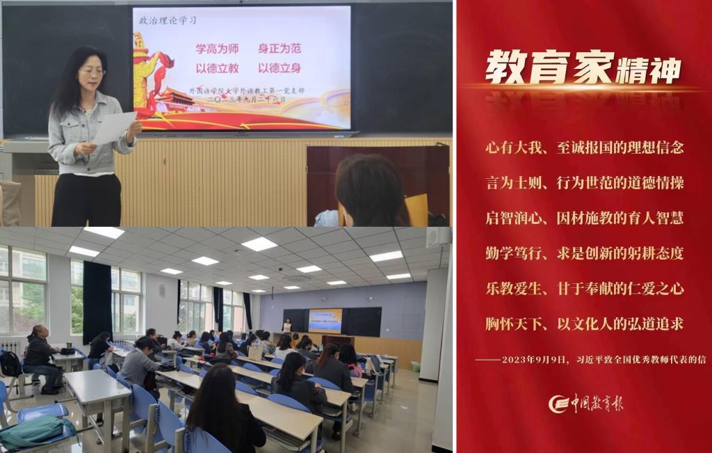 在政治理論學(xué)習(xí)擴(kuò)大會(huì)上,付俊芳領(lǐng)學(xué)了習(xí)近平總書記教師節(jié)重要指示精神,她表示作為新時(shí)代的高等教育工作者,我們要深刻理解習(xí)近平總書記在202399日致全國優(yōu)秀教師代表的信中提出的“心有大我、至誠報(bào)國的理想信念,言為士則、行為世范的道德情操,啟智潤心、因材施教的育人智慧,勤學(xué)篤行、求是創(chuàng)新的躬耕態(tài)度,樂教愛生、甘于奉獻(xiàn)的仁愛之心,胸懷天下、以文化人的弘道追求”教育家精神的科學(xué)內(nèi)涵和內(nèi)在邏輯,牢記為黨育人、為國育才的初心使命,把師德師風(fēng)建設(shè)擺在首要位置,不僅在教學(xué)中為學(xué)生傳授知識,更通過自己的言行舉止為學(xué)生樹立正面榜樣,以赤誠之心、奉獻(xiàn)之心、仁愛之心投身大學(xué)英語教育事業(yè)。葛麗領(lǐng)學(xué)了學(xué)高為師 身正為范 以德立教 以德立身相關(guān)教育內(nèi)容,她談到,習(xí)近平總書記強(qiáng)調(diào):師德是深厚的知識修養(yǎng)和文化品位的體現(xiàn)。師德需要教育培養(yǎng),更需要老師自我修養(yǎng)。做一個(gè)高尚的人、純粹的人、脫離了低級趣味的人,應(yīng)該是每一個(gè)老師的不懈追求和行為常態(tài)。