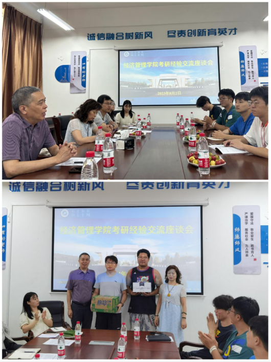 隨后,老師們在崇文樓305會議室同暑期留??佳袑W(xué)生座談。座談會上,經(jīng)濟(jì)管理學(xué)院黨委書記王宏衛(wèi)向暑期留??佳袑W(xué)生表示慰問,他希望備考同學(xué)能樹立遠(yuǎn)大目標(biāo),“志不立,天下無可成之事”,青年當(dāng)用高遠(yuǎn)之志照亮的燦爛人生,將科學(xué)備考與實現(xiàn)人生偉大抱負(fù)結(jié)合起來。要堅持“咬定青山不放松”的精神,迎難而上、扎實學(xué)習(xí),注重積累、積極拓展知識面,保持熱情與動力,砥礪前行。他祝愿考研同學(xué)最終都能“春風(fēng)得意馬蹄疾,一日看盡長安花”。院長王君萍為同學(xué)們介紹了學(xué)院考研的相關(guān)政策及激勵措施,她希望同學(xué)們要注重日常的積累,養(yǎng)成鉆研精神,著重梳理和總結(jié)往年的考研重點(diǎn)和規(guī)律。副院長李春霄從認(rèn)真和堅持兩個方面出發(fā),鼓勵2020級備考學(xué)生在備考過程中要堅持學(xué)習(xí),只要認(rèn)真、方法得當(dāng),就一定會有事半功倍的效果。2022級研究生杜澤萱和2023級研究生梁嘉樂從考研目標(biāo)、考研規(guī)劃、時間管理等方面作了考研經(jīng)驗分享。