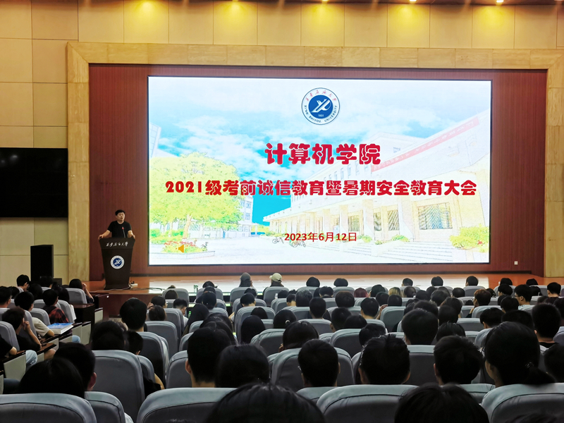 為提高學(xué)生誠(chéng)信思想和安全意識(shí),切實(shí)做好考前誠(chéng)信教育和暑期學(xué)生安全教育管理工作,嚴(yán)肅考風(fēng)考紀(jì),樹立優(yōu)良學(xué)風(fēng),計(jì)算機(jī)學(xué)院于6月12日晚在鄠邑校區(qū)弘石報(bào)告廳舉辦了2021級(jí)學(xué)生考前誠(chéng)信教育暨暑期安全教育大會(huì),2021級(jí)輔導(dǎo)員李路、2021級(jí)全體學(xué)生參加了會(huì)議。