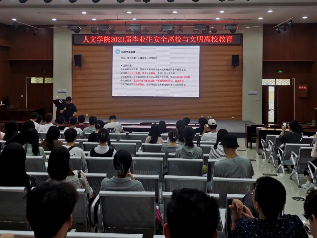 2023屆畢業(yè)生離校在即,為進(jìn)一步加強(qiáng)畢業(yè)生教育管理,增強(qiáng)畢業(yè)生愛(ài)校榮校意識(shí),6月9日上午,人文學(xué)院在鄠邑校區(qū)崇文樓就業(yè)指導(dǎo)中心多功能廳召開(kāi)2023屆畢業(yè)生安全離校與文明離校教育年級(jí)大會(huì)。2019級(jí)全體學(xué)生參加,會(huì)議由2019級(jí)輔導(dǎo)員王凱杰主持。