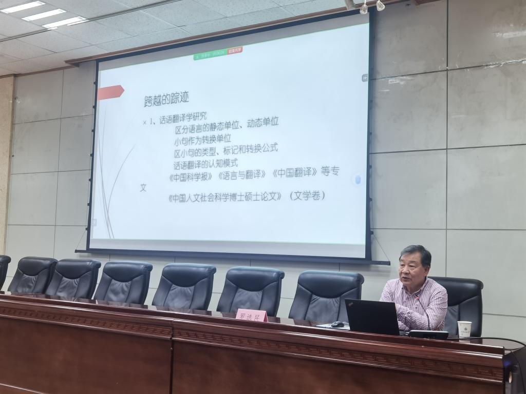 講座中,羅選民教授圍繞其自選集《超越翻譯》的跨學科研究特色,從“提升學術(shù),鑄造精品,以學彰德,以德惠學”的《英華學者文庫》出版宗旨,到跨學科翻譯研究、互文性與翻譯、典籍翻譯的文化自覺、翻譯與中國現(xiàn)代性研究、大翻譯與中國文學的世界傳播、翻譯的認知行為研究等方面詳細闡釋了自己的治學觀;結(jié)合自己的教學科研經(jīng)歷和成果分享了自己“情理交融、龍蟲并雕、中西合璧、推陳出新”的教學科研十六字箴言。羅教授對翻譯工作充滿熱清,他說:“我在超越翻譯,遨游在語言、翻譯、符號世界的同時,也超越了自己”。