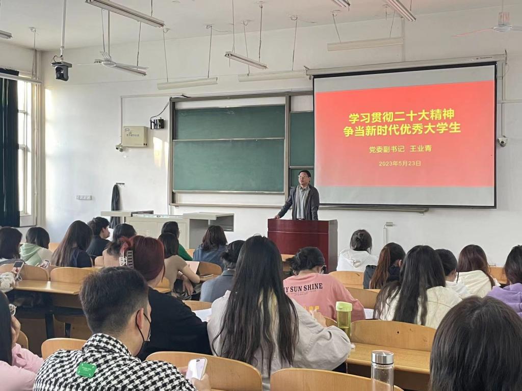 為深入開展學習貫徹習近平新時代中國特色社會主義思想主題教育,5月23日晚19點,外國語學院黨委副書記王業(yè)青在鄠邑校區(qū)B203為外國語學院全體黨員講授“學習貫徹黨的二十大精神,爭當新時代優(yōu)秀大學生”主題黨課,全院100余名學生黨員參加了此次黨課學習。