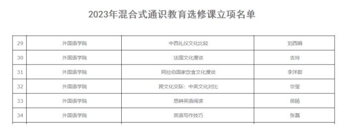 今日,教務(wù)處公布了西安石油大學(xué)關(guān)于2023年混合式通識(shí)教育選修課的立項(xiàng)名單,外國(guó)語(yǔ)學(xué)院有6門通識(shí)教育選修課程入選。