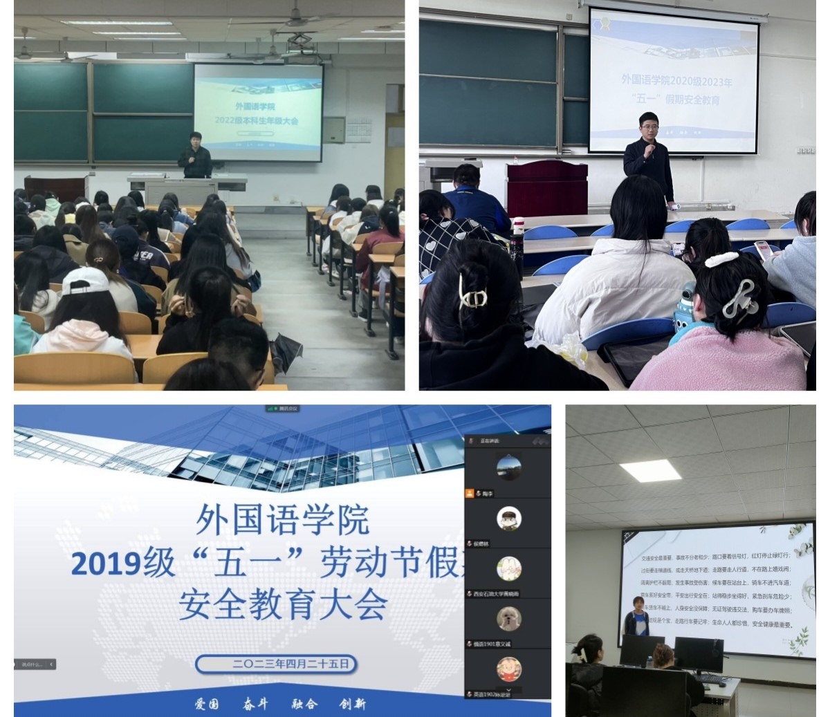 根據(jù)學校和學院安排部署,4月25日至27日,外國語學院在鄠邑校區(qū)B105、B114、A134以及線上形式分別召開“五一”假期安全教育年級大會。