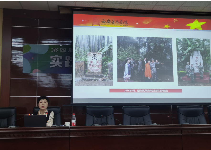 張教授以師生在文藝演出慰問過程中發(fā)生的感人故事入題,講述了她們從2018年開始利用假期組織師生代表組成慰問實踐團先后赴祖國邊防內(nèi)蒙古阿爾山、黑龍江漠河、新疆北山、云南老山等地開展“實踐教學(xué)到基層 藝術(shù)服務(wù)走邊防”實踐慰問活動,向為國戍邊的官兵送去文藝演出的親身經(jīng)歷。分別從“重走總書記視察之路、站在哨所上傾情獻藝、參觀學(xué)習(xí)當(dāng)?shù)丶o念館、與邊防戰(zhàn)士聯(lián)手表演”四個方面通過一個個感人的故事,一幅幅生動形象的圖片讓在場聽眾感受到我們祖國的邊防衛(wèi)士在極其惡劣、艱苦的環(huán)境中表現(xiàn)出的保家衛(wèi)國、無私奉獻的高尚精神。張教授還飽含深情的為大家朗誦了一封《參戰(zhàn)烈士的家信》,在場聽眾都熱淚盈眶。