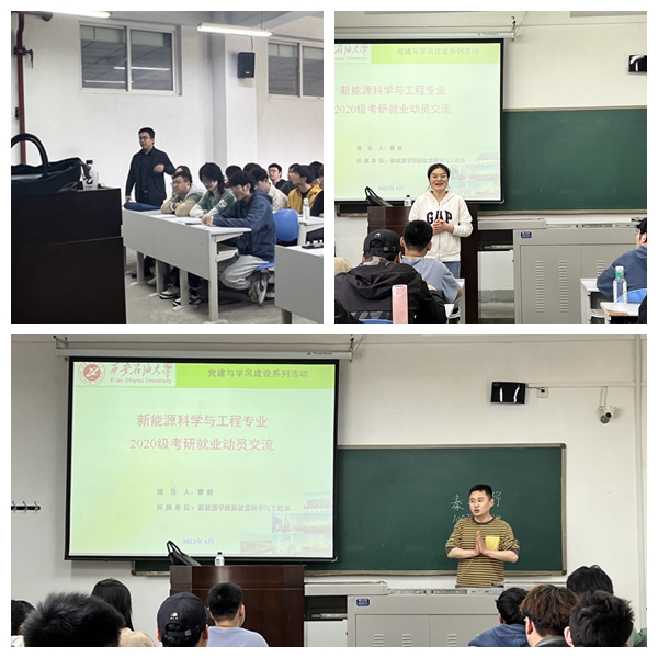 為進(jìn)一步加強(qiáng)學(xué)院學(xué)風(fēng)建設(shè),夯實(shí)三全育人工作理念,建立“系+學(xué)工協(xié)同育人機(jī)制,構(gòu)建黨建+學(xué)風(fēng)協(xié)同育人模式,幫助2024屆畢業(yè)生提前明確未來發(fā)展方向,合理制定考研目標(biāo),樹立正確的就業(yè)觀念,切實(shí)激發(fā)起學(xué)生學(xué)習(xí)的內(nèi)在動(dòng)力,營(yíng)造出良好的學(xué)習(xí)氛圍,根據(jù)新能源學(xué)院黨委安排,410-14日期間,學(xué)院各專業(yè)師生黨支部結(jié)對(duì)共建活動(dòng)暨2024屆考研就業(yè)師生座談會(huì)邑校區(qū)相繼召開。