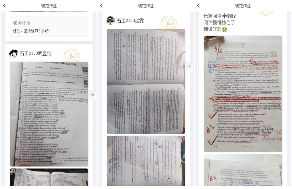 學院開展以“宿舍—班級—學院”三級聯(lián)動的英語四級幫扶計劃。宿舍以“一帶一”“一帶多”帶動英語學習,營造濃厚的英語學習氛圍。班級以建群打卡背單詞、英語四級朋輩課堂等督促學生努力學習英語,為英語較差的同學鞏固英語基礎,為英語較好的同學保持英語水平。學院定時開展英語四級講座、英語四級模擬考,為學生傳授英語四級通過技巧,并讓學生在考試中、在實際應用中逐漸進步。