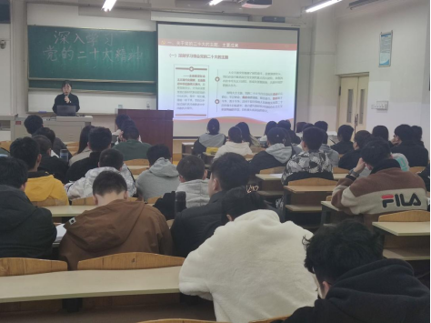 胡娟解讀了黨的二十大的會議主題和主要成果,同大家一道回顧了過去5年黨和國家的主要工作以及新時代10年的偉大變革。隨后闡述了馬克思主義中國化時代化和中國式現(xiàn)代化的深刻內涵,以及黨和國家關于實現(xiàn)全面建設社會主義現(xiàn)代化國家未來五年的戰(zhàn)略部署。同時,她強調全面建設社會主義現(xiàn)代化國家、全面推進中華民族偉大復興,關鍵還在中國共產黨,必須持之以恒推進全面從嚴治黨。最后,胡娟向同學們發(fā)起倡議:“我們要認真學習領會黨的二十大精神,緊密團結在以習近平同志為核心的黨中央周圍,高舉中國特色社會主義偉大旗幟,全面貫徹習近平新時代中國特色社會主義思想,牢記空談誤國、實干興邦,堅定信心、同心同德,埋頭骨干、奮勇前進,為全面建設社會主義現(xiàn)代化國家、全面推進中華民族偉大復興而團結奮斗!”