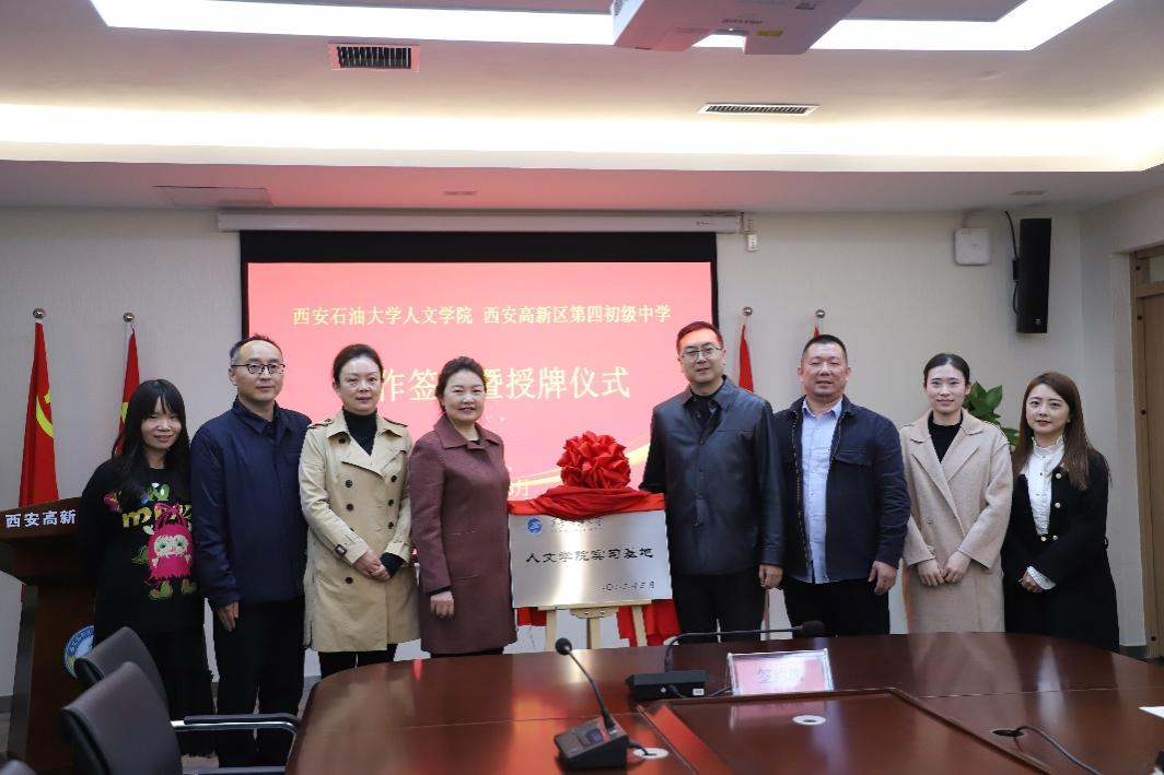 在簽約儀式上,萬江校長向李濤院長一行介紹了西安高新區(qū)第四初級中學的基本情況、教育教學成果以及教師隊伍建設等。李濤院長也代表西安石油大學人文學院作了發(fā)言,她首先對萬江校長對學生美育做出的貢獻以及其先進的教育理念表示贊賞,隨后向萬校長及教師代表介紹了人文學院的專業(yè)概況和學科發(fā)展現(xiàn)狀,以及我院人才培養(yǎng)的思路,并表達了與高新四初相互合作,為其藝術教育事業(yè)添磚加瓦,共建實習基地的美好愿景。隨后,雙方就兩校藝術合作項目,以及實習基地的共建方式等話題進行了深入交流,并舉行了掛牌儀式,雙方達成共識,分別簽署了實習基地共建協(xié)議。