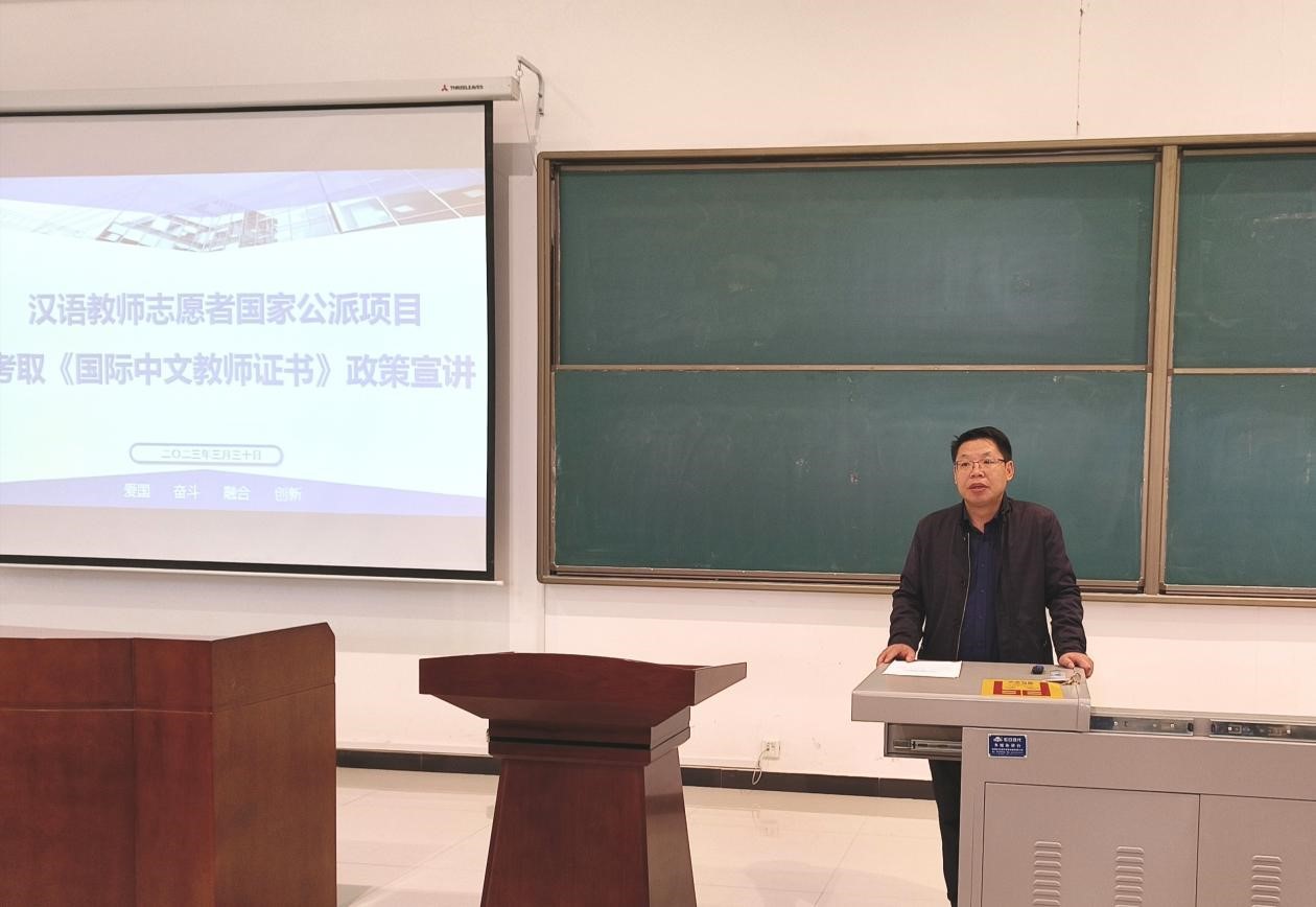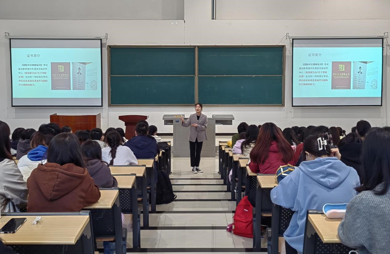 為進(jìn)一步做好學(xué)生職業(yè)規(guī)劃,促進(jìn)畢業(yè)生高質(zhì)量就業(yè)。3月30日學(xué)院在石工地科樓115舉辦漢語教師志愿者國家公派項(xiàng)目政策宣講會(huì)。邀請(qǐng)陜西省漢語國際教育研究會(huì)副秘書長、《國際中文教師證書》西安外國語大學(xué)認(rèn)證中心考務(wù)負(fù)責(zé)人張青作專題宣講。副書記王業(yè)青主持,輔導(dǎo)員陳浩及2019級(jí)、2020級(jí)本科生和2022級(jí)研究生共計(jì)200余人參加了此次宣講會(huì)。