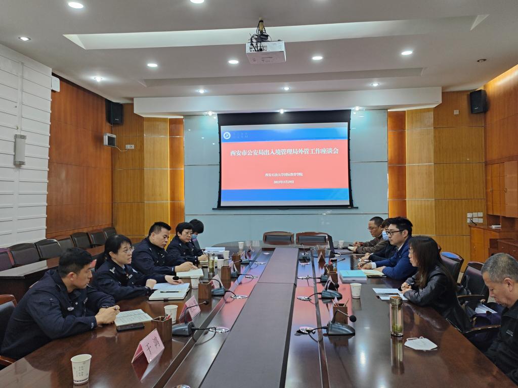 3月29日上午,西安市公安局出入境管理局外管工作座談會在雁塔校區(qū)會議中心第四會議室召開。西安市公安局出入境管理局副局長劉姿英、公安雁塔分局副局長楊忠智,國際教育學院院長董皓、保衛(wèi)處處長楊西坤參加座談會,國際教育學院副院長顏庭星主持座談會。