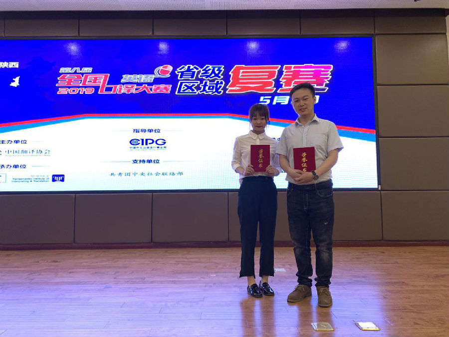 5月11日,2019年第八屆全國口譯大賽(英語)陜西賽區(qū)復賽在西安科技大學臨潼校區(qū)舉行。本次陜西賽區(qū)復賽由西安科技大學和華譯教育咨詢有限公司聯(lián)合組織實施,來自全省高校的百余名選手參加了比賽。我校外國語學院派出4名學生參加本次比賽,其中,2017級翻譯碩士研究生劉耀以排名第七的好成績獲得二等獎,成功晉級大區(qū)賽。2018級翻譯碩士研究生易可獲得三等獎。