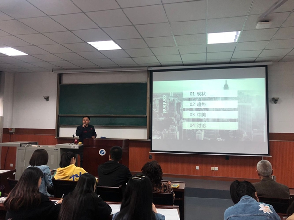 陳丁博士,畢業(yè)于西安交通大學(xué)獲博士學(xué)位,美國堪薩斯大學(xué)訪問學(xué)者,報(bào)告題目為《多棱鏡下的美國》。報(bào)告主要內(nèi)容從社會(huì)、教育、民生、環(huán)境等多個(gè)角度,展示、分析當(dāng)今美國的發(fā)展現(xiàn)狀;通過對(duì)比美國十年間的變化,探討了未來美國的可能發(fā)展走勢(shì);并對(duì)中美間未來的關(guān)系特征提出自己的判斷,并對(duì)計(jì)劃前往美國學(xué)習(xí)、訪問、工作的聽眾,提供了個(gè)人建議。