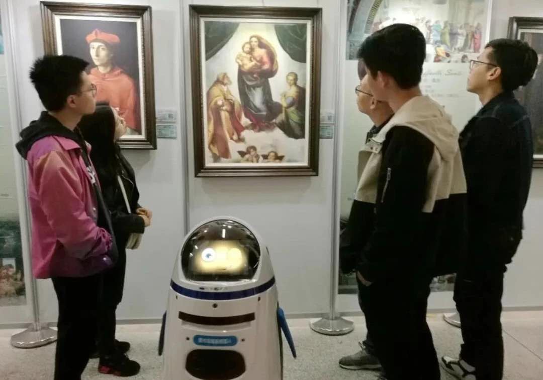 此次畫(huà)展展出了從十三世紀(jì)到二十世紀(jì)的世界著名油畫(huà)近30幅,有達(dá)芬奇、莫奈、畢加索、梵高等西方藝術(shù)史上最富盛名的大師的作品,涵蓋了文藝復(fù)興、古典主義、印象主義、后印象主義等藝術(shù)流派。展覽的畫(huà)作下配有二維碼,掃碼后可以聆聽(tīng)到對(duì)作品詳細(xì)的音頻講解和優(yōu)美的同時(shí)期的世界名曲。同時(shí),圖書(shū)館還首次引進(jìn)了智能機(jī)器人服務(wù)模式,集自主交互、咨詢(xún)查詢(xún)、講解宣傳、引導(dǎo)提醒、智慧辦公、休閑放松等多功能為一體,機(jī)器人叮小胖為師生們聲情并茂地介紹著每幅畫(huà)作,讓廣大參觀者享受到一次別具一格的藝術(shù)盛宴。