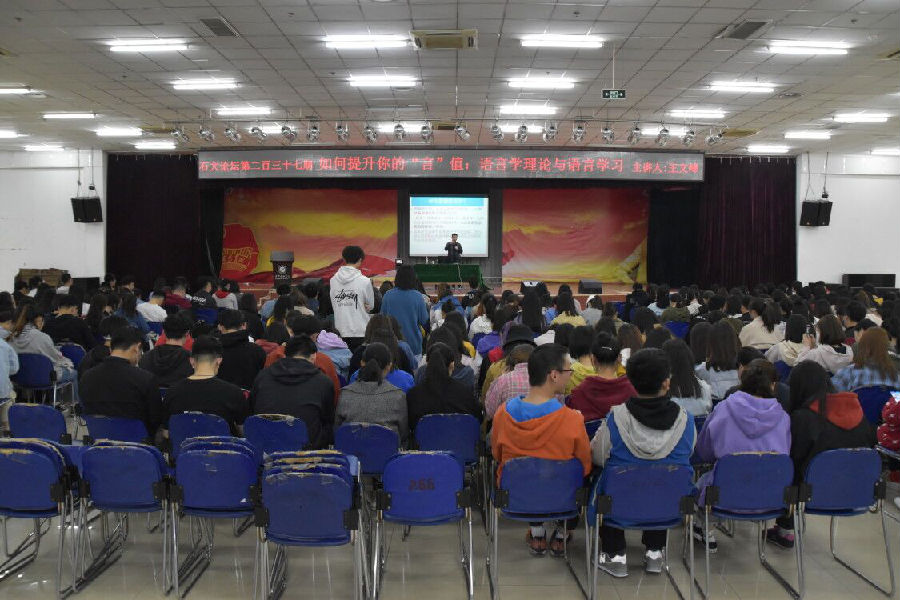 3月26日晚,由校團(tuán)委主辦、外國語學(xué)院團(tuán)委學(xué)生會承辦的石大青年論壇第237期“如何提升你的‘言’值:語言學(xué)理論與語言學(xué)習(xí)”在鄠邑校區(qū)騰輝大學(xué)生活動中心舉行,本期論壇邀請了我院青年教師王文峰博士擔(dān)任主講,我院全體學(xué)生以及學(xué)校其他院系學(xué)生參加了此次講座。