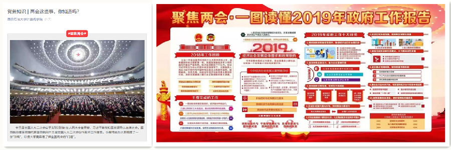 積極關(guān)注“兩會(huì)”動(dòng)態(tài),加強(qiáng)“兩會(huì)”知識(shí)宣傳。學(xué)院依托“西油計(jì)”微信公眾號(hào)、微信群、QQ群和展板等多種平臺(tái),集中開展“‘兩會(huì)’那些事兒”、“一圖看懂2019年政府工作報(bào)告”等知識(shí)點(diǎn)宣傳,實(shí)現(xiàn)宣傳進(jìn)教研室、進(jìn)年級(jí)、進(jìn)支部、進(jìn)班級(jí)、進(jìn)宿舍。