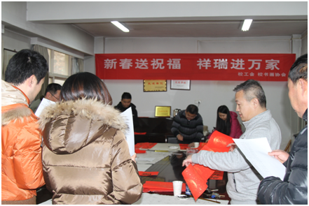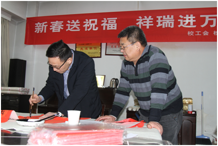 2019年1月14日,農(nóng)歷己亥新年來臨之際,由校工會和校書畫協(xié)會組織的“新春送祝福 祥瑞進萬家”送春聯(lián)活動在校工會會議室進行,來自我校書畫協(xié)會的三位書法愛好者現(xiàn)場為我校教職工義務(wù)書寫春聯(lián),送上校工會對全體教職工的新春祝福。校黨委副書記、校書畫協(xié)會會長雷西合也從百忙之中來到現(xiàn)場為大家書寫春聯(lián),我校教職工、離退休職工紛紛前來,現(xiàn)場歡聲笑語,一片祥和景象。
