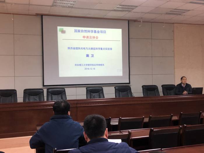 2018年12月18日。理學(xué)院邀請西安理工大學(xué)施衛(wèi)教授在雁塔校區(qū)會(huì)議中心第三會(huì)議室進(jìn)行了關(guān)于國家自然科學(xué)基金申請及體會(huì)的報(bào)告會(huì)。傅海威院長主持會(huì)議,理學(xué)院博士及副高以上教師50余人參加了報(bào)告會(huì)。