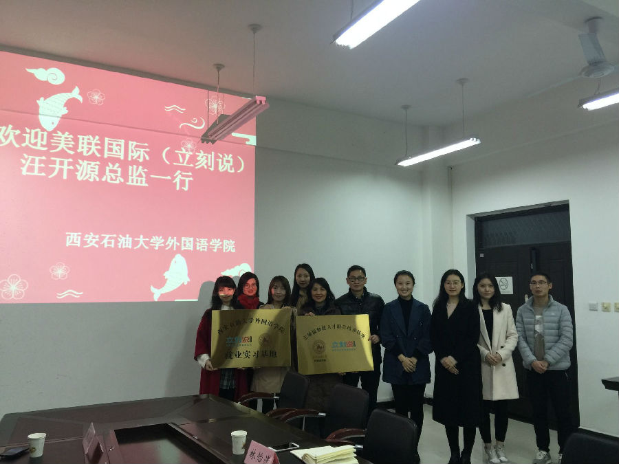 2018年11月15日早上11點(diǎn),外國(guó)語(yǔ)學(xué)院與美聯(lián)國(guó)際教育(立刻說(shuō))實(shí)習(xí)就業(yè)基地掛牌儀式在鄠邑校區(qū)人文經(jīng)管樓318舉辦。掛牌儀式由學(xué)管辦主任蔣曙光老師主持,參與此次掛牌儀式的領(lǐng)導(dǎo)老師有外國(guó)語(yǔ)學(xué)院黨委書記廖敏、立刻說(shuō)首席總監(jiān)汪開源、立刻說(shuō)教學(xué)經(jīng)理鄧松林和外國(guó)語(yǔ)學(xué)院全體輔導(dǎo)員老師。