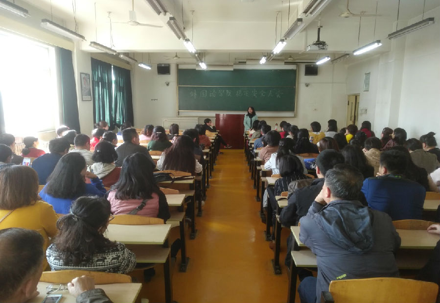 2018年10月26日,外國(guó)語(yǔ)學(xué)院黨委在雁塔校區(qū)二號(hào)教學(xué)樓1211#召開(kāi)全院教師大會(huì)。院黨委書(shū)記廖敏帶領(lǐng)全體教師一起認(rèn)真學(xué)習(xí)了《中華人民共和國(guó)反恐怖主義法》。