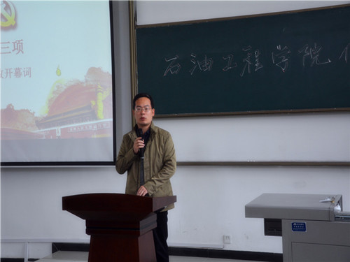 接著,活動(dòng)進(jìn)入?yún)R報(bào)展示環(huán)節(jié)。各支部匯報(bào)人圍繞“弘揚(yáng)愛國主義精神”、“春雨精神與圖書漂流活動(dòng)”、“創(chuàng)先爭優(yōu),樹立旗幟”、“踐行‘沙柳精神’”、“‘油’你來講”、“黨員讀書交流匯”、“學(xué)做結(jié)合有創(chuàng)新,支部活動(dòng)顯活力”等主題,從立意、做法、成效三個(gè)方面進(jìn)行了匯報(bào)與展示。匯報(bào)環(huán)節(jié)結(jié)束后,6位黨員同志朗誦了石油工程學(xué)院輔導(dǎo)員原創(chuàng)作品《春雨頌》。