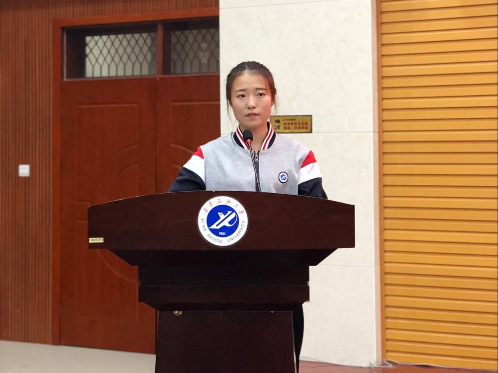 見面會(huì)上,學(xué)院領(lǐng)導(dǎo)及嘉賓為新生代表佩戴了?;?,參會(huì)老師和新生都為自己佩戴上了學(xué)校?;?。?;张宕鲀x式使得師生見面會(huì)更具有儀式感,讓新生們更加以西石大人的身份而自豪、榮耀。應(yīng)化1803班楊蓉同學(xué)在見面會(huì)上做了新生代表發(fā)言。