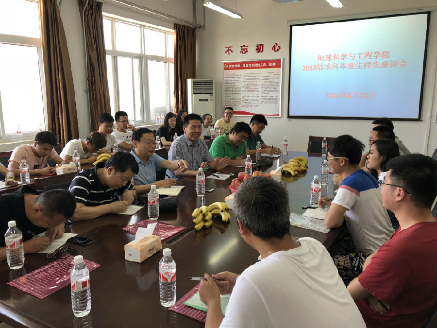 6月21日下午2:00,地球科學與工程學院在鄠邑校區(qū)石工地科樓507會議室舉行2018屆畢業(yè)生師生座談會,地球科學與工程學院黨委書記馬行天、副書記李慶本、副院長宋立軍、各系主任吳少波、蘇海、郭峰、輔導員李化杰,以及畢業(yè)生代表30余人參加座談會,座談會由李慶本主持。