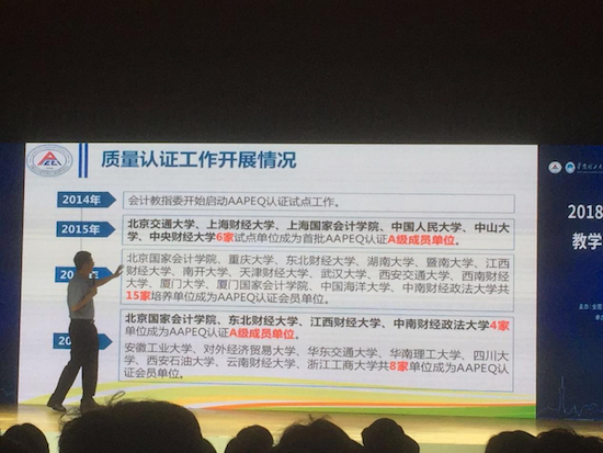 首先,全國(guó)會(huì)計(jì)專業(yè)學(xué)位研究生教育指導(dǎo)委員會(huì)秘書(shū)長(zhǎng)王化成教授簡(jiǎn)要介紹了我國(guó)現(xiàn)階段MPAcc項(xiàng)目的發(fā)展情況,對(duì)2017年全國(guó)MPAcc教育工作進(jìn)行了詳細(xì)的總結(jié),并深入探討了未來(lái)MPAcc教育發(fā)展思路。他同時(shí)提出,在當(dāng)今MPAcc培養(yǎng)單位數(shù)量快速增加且培養(yǎng)學(xué)生的人數(shù)初具規(guī)模的情況下,各MPAcc培養(yǎng)單位應(yīng)當(dāng)致力于提升辦學(xué)質(zhì)量,注重改革創(chuàng)新,推進(jìn)會(huì)計(jì)碩士專業(yè)學(xué)位教育改革。隨后,來(lái)自東北大學(xué)的于麗萍教授、北京國(guó)家會(huì)計(jì)學(xué)院的賀穎奇教授、東北財(cái)經(jīng)大學(xué)的陳艷利教授、江西財(cái)經(jīng)大學(xué)的章衛(wèi)東教授及中南財(cái)經(jīng)政法大學(xué)的王昌銳教授分別向與會(huì)代表分享了各自院校MPAcc的項(xiàng)目特色和培養(yǎng)經(jīng)驗(yàn)。會(huì)議最后,全國(guó)會(huì)計(jì)專業(yè)學(xué)位研究生教育指導(dǎo)委員秘書(shū)處辦公室主任王永研詳細(xì)解讀了《2018年會(huì)計(jì)碩士專業(yè)學(xué)位授權(quán)點(diǎn)專項(xiàng)評(píng)估方案》,以幫助各院校更好地開(kāi)展專項(xiàng)評(píng)估工作,進(jìn)一步提升MPAcc項(xiàng)目培養(yǎng)質(zhì)量。同時(shí),會(huì)議還為包括北京國(guó)家會(huì)計(jì)學(xué)院、東北財(cái)經(jīng)大學(xué)會(huì)計(jì)學(xué)院、江西財(cái)經(jīng)大學(xué)會(huì)計(jì)學(xué)院、中南財(cái)經(jīng)政法大學(xué)會(huì)計(jì)學(xué)院在內(nèi)的4所新增會(huì)計(jì)專業(yè)學(xué)位教育質(zhì)量認(rèn)證(AAPEQ)成員單位頒發(fā)證書(shū)。