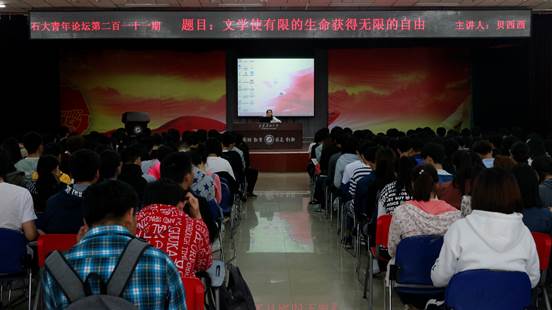 為進一步開展好第二屆“書香校園”建設活動,由校團委主辦,化學化工學院承辦的第211期石大青年論壇之“書香校園”建設主題報告于2018年4月17日晚19:00在鄠邑校區(qū)騰輝活動中心舉行。報告特邀柳青文學獎獲得者、陜西青年作家貝西西主講,學院黨委副書記劉小波、校團委老師周宇、學院2017級輔導員楊夢琳及390余名同學聆聽報告。