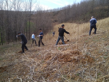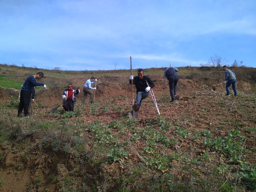 馬書記一行首先來到結對幫扶困難群眾王歲仔的家中,代表地學院向王歲仔送上了學院師生捐贈的衣物兩包,并了解了他的近期生產(chǎn)生活情況。隨后,馬書記一行帶著提前購買的核桃樹苗、鐵鍬等農(nóng)具,來到十多里外王歲仔位于老村的撂荒坡地,幫助王歲仔種植核桃樹苗。大家一起動手,干勁十足,在兩畝多坡地上種植了一百余棵核桃樹苗。幫助王歲仔利用撂荒坡地種植經(jīng)濟林木是地學院精準扶貧工作的一項具體舉措,為此,地學院提前聯(lián)系我校駐村扶貧干部董丙劍老師幫助購買了核桃樹苗,考慮到王歲仔腿部有殘疾,無法從事體力勞動,學院此次專門組織教職工幫助其栽種樹苗。