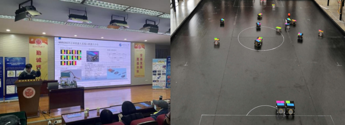 半自主足球機器人軟件系統(tǒng)展演將整場科技活動推向了高潮。參展同學介紹了中國機器人大賽項目分類,這是一個極富挑戰(zhàn)性的高技術密集型項目,重點圍繞半自主項目機器人小車、攝像裝置、計算機主機和無線發(fā)射裝置開發(fā)的軟件系統(tǒng)進行了精彩講述,告訴同學們基礎學科的理論知識非常重要,它們在視覺系統(tǒng)判定機器人與球在場地的位置方向,決策系統(tǒng)判斷機器人攻守姿態(tài)中應用廣泛。當播放參賽實況視頻時,在場師生被瞬間帶入緊張激烈的RoboCup機器人世界杯比賽現(xiàn)場,一同感受盛大的國際機器人競技盛宴,中學師生不時傳來陣陣贊嘆聲和驚呼聲。當展示同學介紹到,學校足球機器人團隊18年來榮獲國家級獎項100項以上,2023年10月榮獲2023中國機器人大賽FIRA小型組半自主賽項冠軍1項、亞軍1項,中央電視臺新聞頻道播放了我校參賽團隊決賽的精彩片段時,場下的中學師生響起雷鳴般的掌聲。