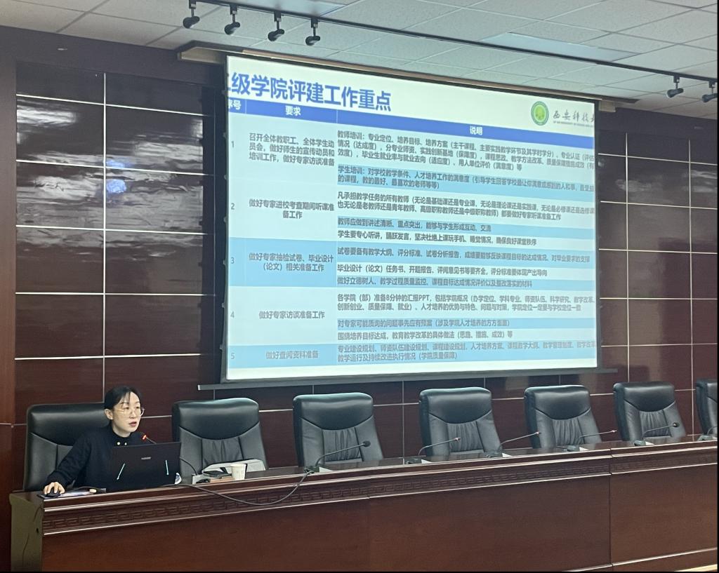 趙蕾主任長(zhǎng)期從事高校本科教學(xué)質(zhì)量監(jiān)督、教學(xué)督導(dǎo)、專業(yè)認(rèn)證、教學(xué)評(píng)估等工作,具有豐富的審核評(píng)估工作經(jīng)驗(yàn)。她從從全國(guó)及陜西省評(píng)估情況、推進(jìn)學(xué)術(shù)型人才培養(yǎng)的思考、評(píng)建工作中存在的一些典型問題及整改措施、審核評(píng)估中的重點(diǎn)工作提示幾個(gè)方面進(jìn)行了詳細(xì)介紹。她強(qiáng)調(diào)了自評(píng)自建的重要性,并分享了西安科技大學(xué)在調(diào)整專業(yè)布局、優(yōu)化人才培養(yǎng)方案、推進(jìn)科教融合等方面的做法。趙蕾老師的分享內(nèi)容深入淺出,既有理論高度,又有實(shí)踐指導(dǎo)意義,為學(xué)院教師提供了寶貴的參考和啟示。