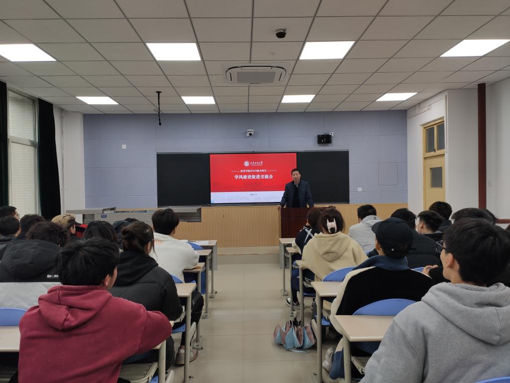 會上,茍毅飛首先對學(xué)風(fēng)建設(shè)工作的重要性及當(dāng)前學(xué)院的學(xué)風(fēng)現(xiàn)狀進行了具體介紹和客觀分析。他指出,學(xué)風(fēng)是校風(fēng)、教風(fēng)、師德師風(fēng)的本質(zhì)反映,是辦學(xué)理念和辦學(xué)水平的充分彰顯,良好的學(xué)風(fēng)可以起到規(guī)范、引導(dǎo)學(xué)習(xí)發(fā)展的作用。開展學(xué)風(fēng)建設(shè)可以培養(yǎng)學(xué)生明禮誠信、團結(jié)友愛、勤儉自強、敬業(yè)奉獻的基本道德規(guī)范,良好的學(xué)風(fēng)能夠幫助同學(xué)們更好學(xué)習(xí)掌握科學(xué)文化知識,樹立誠實守信的價值觀念。因此,必須把學(xué)風(fēng)建設(shè)當(dāng)成一項重要的工作,常抓不懈。進而,在分析學(xué)院學(xué)風(fēng)現(xiàn)狀和存在問題的基礎(chǔ)上,提出了學(xué)風(fēng)建設(shè)的基本思路和基本目標(biāo),要求逐步建立學(xué)風(fēng)建設(shè)的長效機制,培養(yǎng)同學(xué)們自覺學(xué)習(xí)的習(xí)慣和誠信意識,努力做到“八高四低”,即學(xué)生出勤率高、及格率高、過級率高、獲獎率高、社會實踐參與人數(shù)比例高、考研率高、就業(yè)率高、校園文化活動層次高;學(xué)生不及格率低、違紀(jì)率低、曠課率低、退學(xué)警告率低。最后,從加強日常管理,促進規(guī)范養(yǎng)成;加強班級建設(shè),以優(yōu)良班風(fēng)推動學(xué)風(fēng)建設(shè);開展主題教育活動,培養(yǎng)良好學(xué)習(xí)風(fēng)氣,營造濃厚學(xué)習(xí)氛圍等三個方面提出了加強學(xué)院學(xué)風(fēng)建設(shè)的具體措施,同時希望同學(xué)們端正學(xué)習(xí)態(tài)度,明確學(xué)習(xí)目標(biāo),制定學(xué)習(xí)計劃,采取具體行動,以良好的精神面貌全力以赴、全身心投入,成為學(xué)風(fēng)建設(shè)中的佼佼者,排頭兵,共同營造積極向上的學(xué)習(xí)氛圍,促進學(xué)院良好學(xué)風(fēng)建設(shè)長效機制的形成。