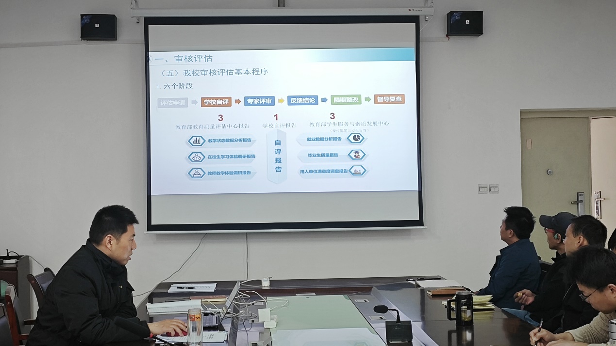 會(huì)議第二項(xiàng),李慶本帶領(lǐng)全體教職工開展本科教育教學(xué)思想大討論專題學(xué)習(xí)。他向全體教職工講解了新一輪教育教學(xué)審核評估的背景意義、指導(dǎo)原則、指標(biāo)體系等方面內(nèi)容,重點(diǎn)介紹了我校新一輪審核評估工作的工作部署、基本程序、準(zhǔn)備工作以及教職工應(yīng)知應(yīng)會(huì)等方面的知識內(nèi)容。