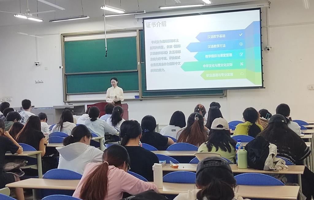 西安外國語大學(xué)考試認證中心張青及工作人員一行,為學(xué)生帶來了一場關(guān)于國際中文教師證書考試及孔子學(xué)院志愿者項目介紹的宣講會,圍繞國際中文教師證書簡介、考試內(nèi)容、證書用途、國際中文教師志愿者和備考指南等五個方面來進行詳細的介紹,著重講解了國際漢語教師志愿者應(yīng)具備的知識與能力,專業(yè)知識學(xué)習(xí)的方法和規(guī)劃,使同學(xué)們對《國際中文教師證書》有了全面了解和新的認識。西安外國語大學(xué)考試認證中心楊琛老師結(jié)合自己在國外工作和求學(xué)成長的經(jīng)歷,分享自己在柬埔寨做國際中文教師志愿者的工作經(jīng)歷和國外生活的感悟,鼓勵激勵同學(xué)們夯實專業(yè)基礎(chǔ)、積極實踐、打開視野、拓寬未來的就業(yè)思路,勇敢走出去積極傳播中華文化。